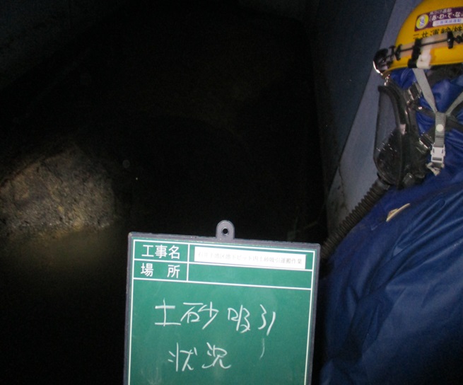 1.西の浜遊水池整備工事 10tパワープロベスター車による土砂吸引 土砂吸引状況 10tパワープロベスター車による側溝清掃 2.石井手地区地下ピット内清掃工事 10tパワープロベスター車による土砂吸引 作業開始前、酸素濃度測定実施 エアーラインマスクを着用し土砂吸引作業実施 3.ジェットパック内石灰回収作業 10tパワープロベスター車による石灰吸引 タンク内での石灰吸引状況 レシーバータンクを利用してフレコンに回収